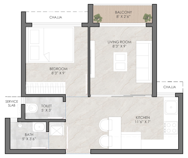 - 1BHK Premium Flat with balcony, Carpet Area 318 sq. ft.